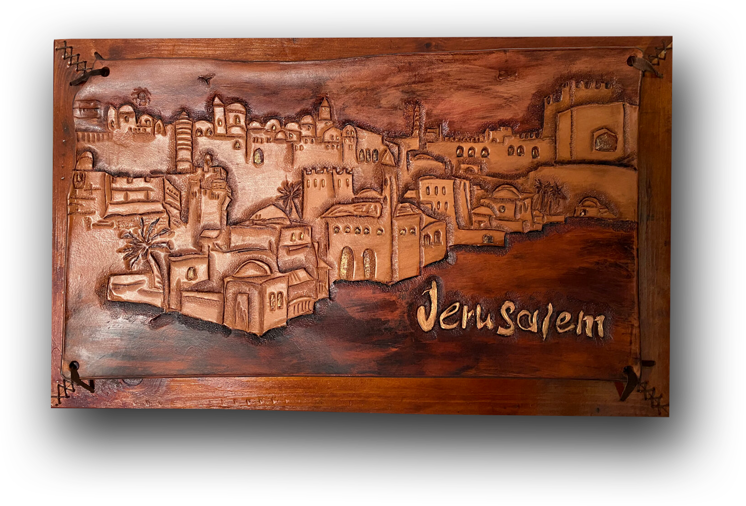 Я живу в Иерусалиме, и именно этот удивительный город дает мне вдохновение. Я рисую древнюю архитектуру этого святого города. И, «рисую» я, не кисточкой, как другие художники, а…. молотком. Это невероятно вдохновенно- выбивать на толстой коже каждый кирпичик в стенах древних строений! Это, конечно, очень кропотливая и безумно сложная работа, но зато изображения в коже – вечны, как древние стены Иерусалима.